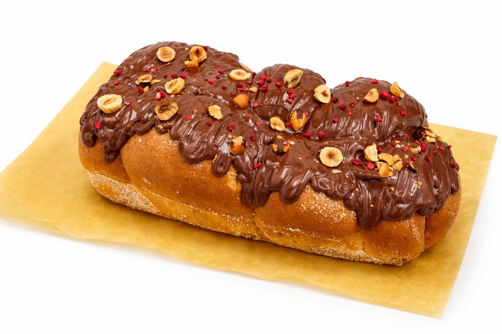 Ръчно месен козунак с пълнеж от нежен течен шоколад, залят с шоколад.