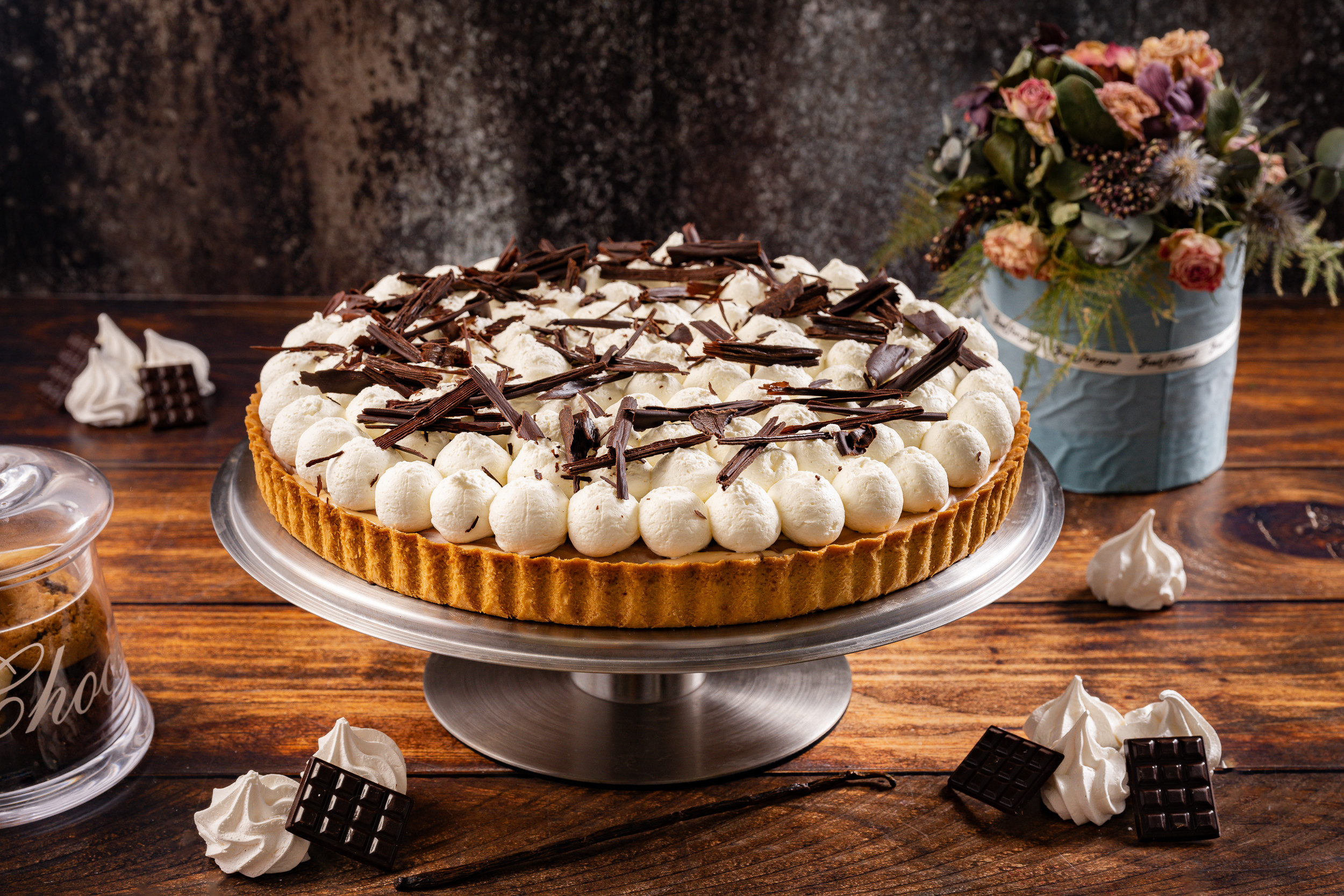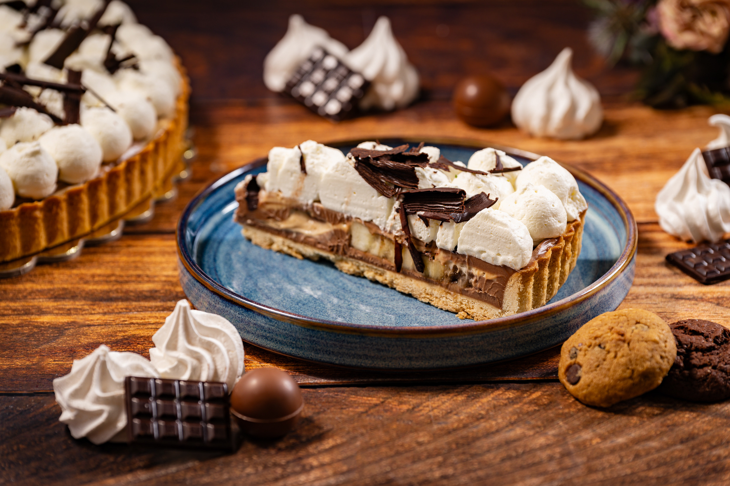 Ронливо-маслен тарт с пълнеж от банани, шоколадов и карамелен ганаш и крем шантий.