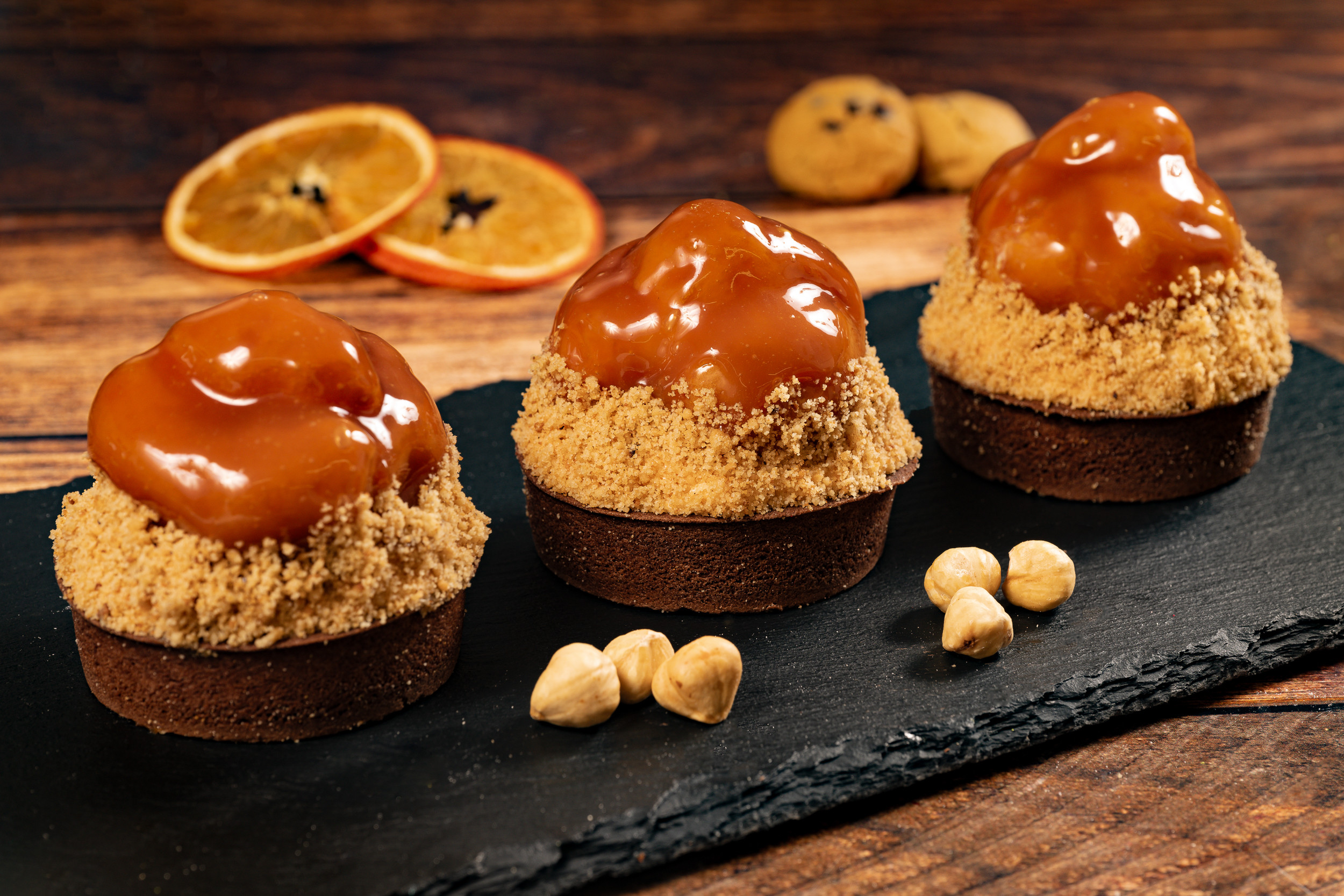 Ронливо-маслена кошница с какао, център от тофи крем с еклер, запълнен с ванилов крем и залят с карамел.