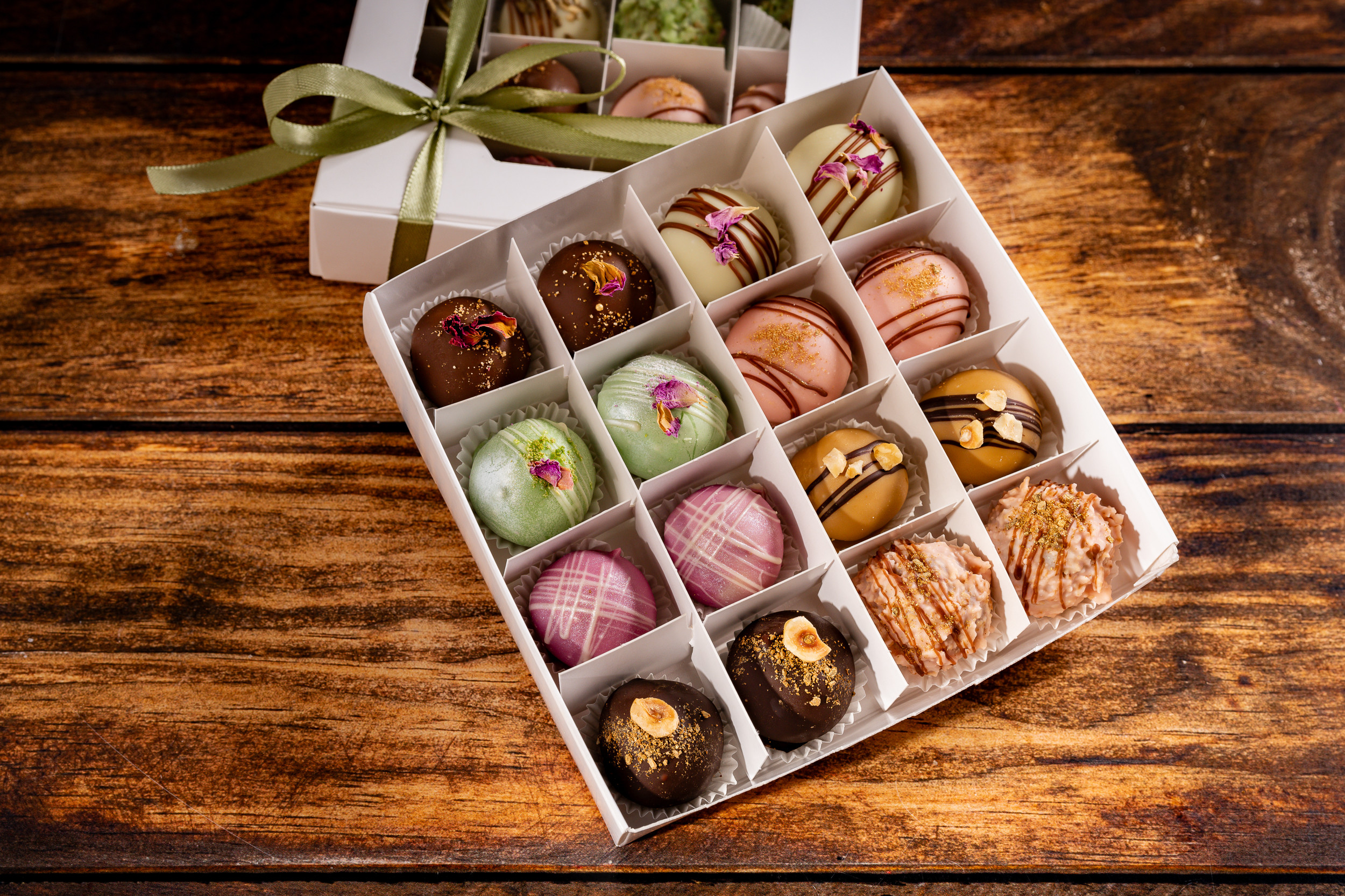 С пълнеж от шоколад, карамел и шамфъстък.
