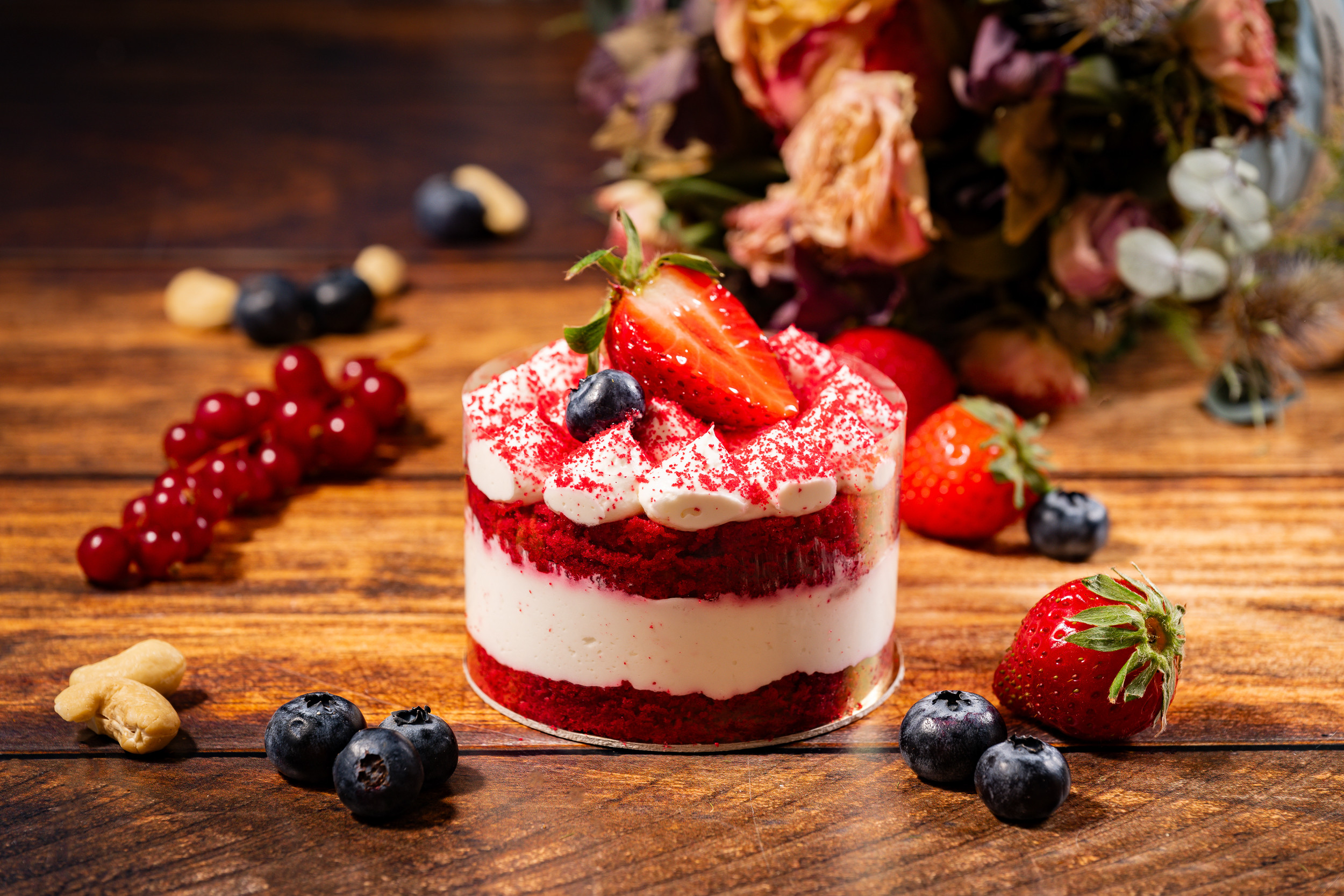 Кадифе блатове с лек чийзкрем и ягодов пълнеж.