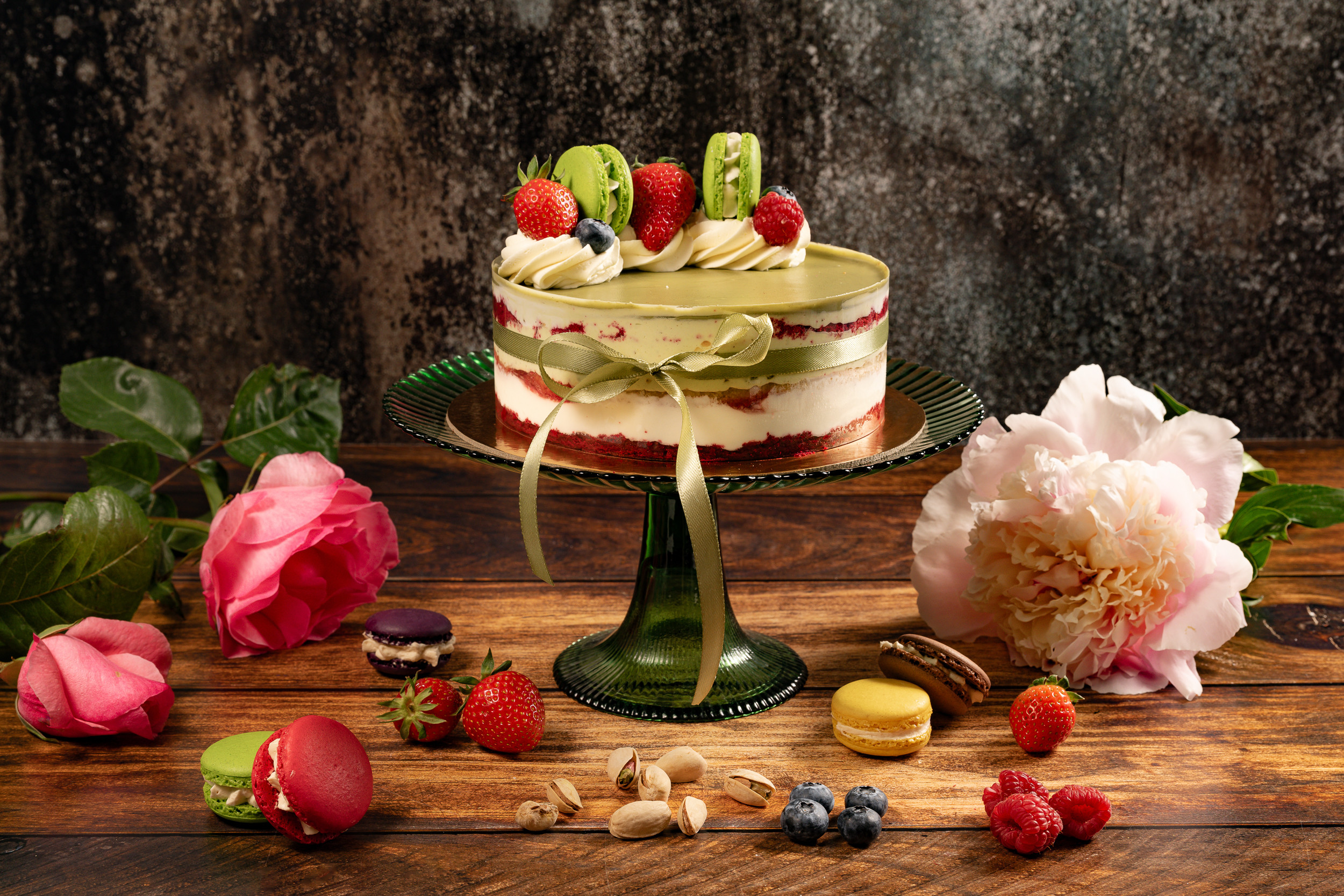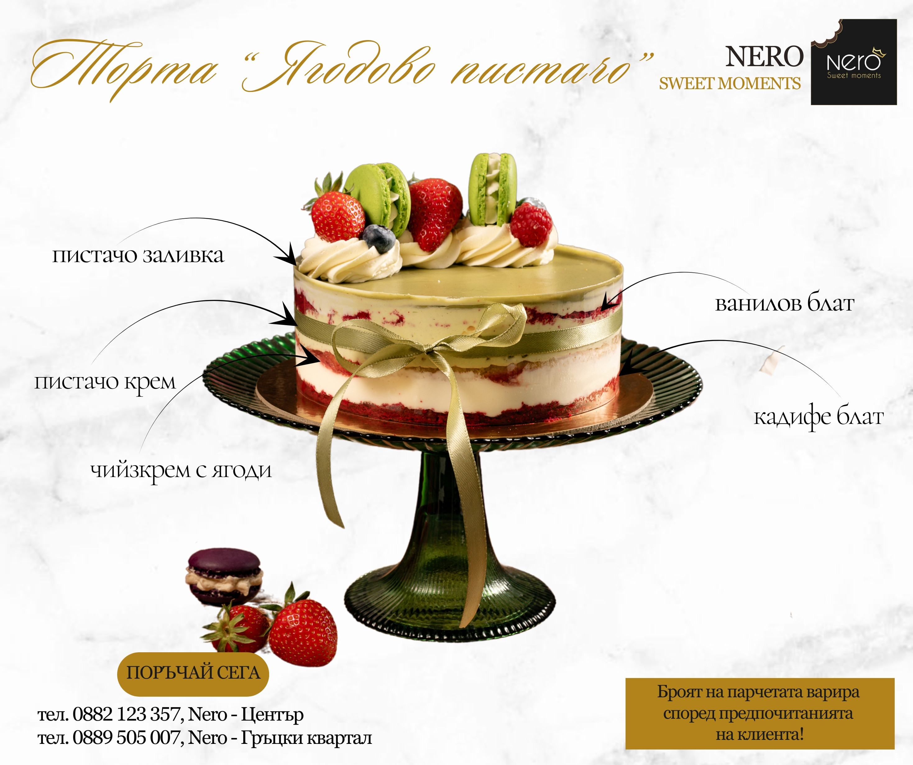 Кадифе и ванилов блат, чийзкрем с ягоди, пистачо крем и заливка от пистачо.
